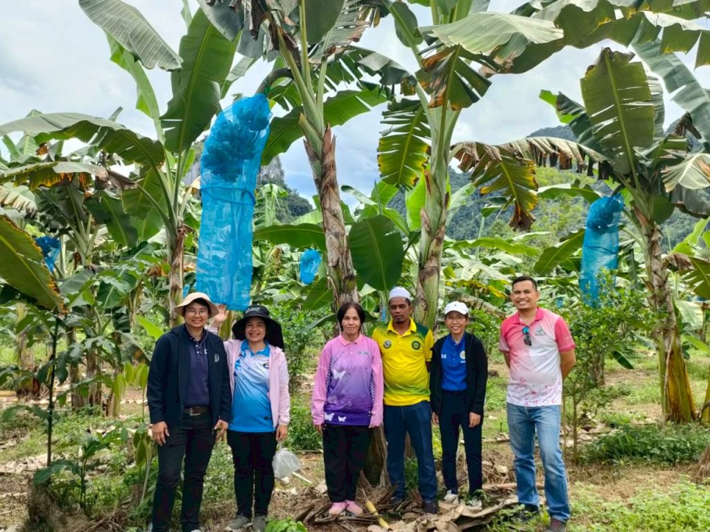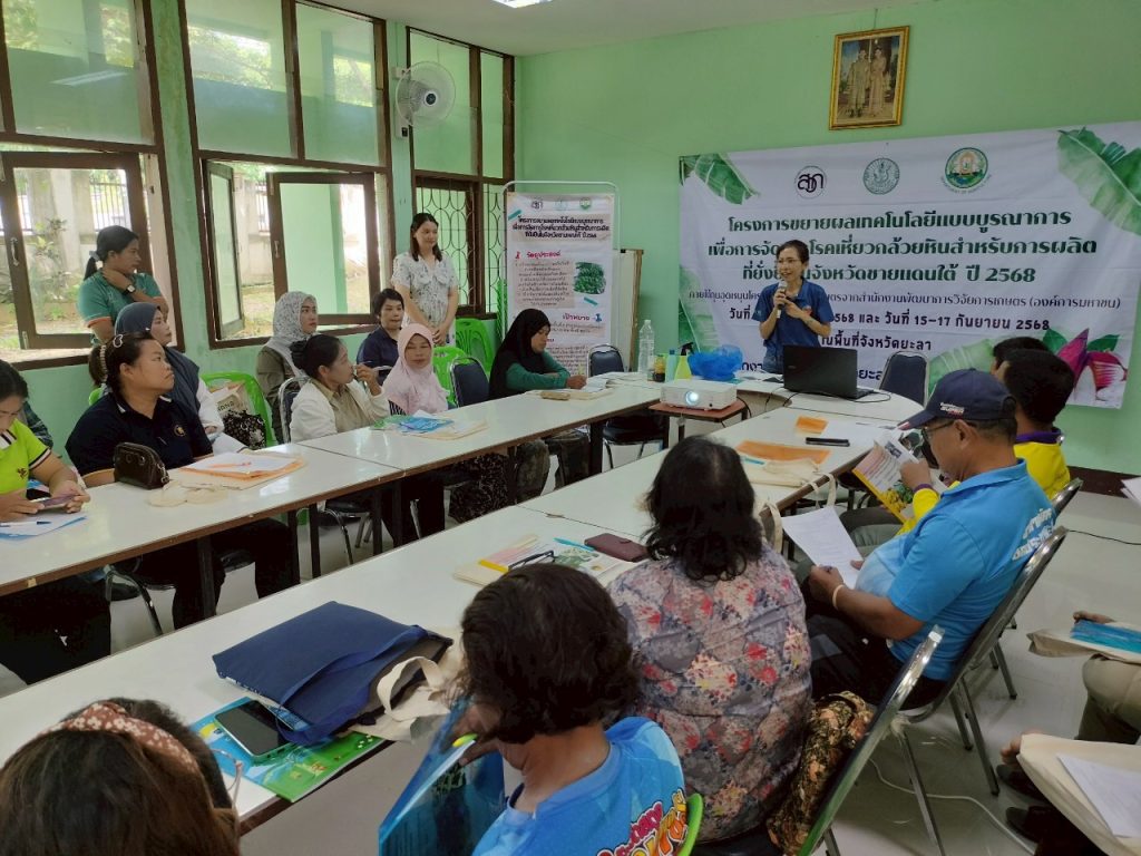 วันที่ 16-17 กันยายน 2568 น.ส.จุฬาภรณ์ นกสกุล ผู้อำนวยการกลุ่มส่งเสริมการวินิจฉัยศัตรูพืช และน.ส.กนิษฐา วรรณชาติ ผู้อำนวยการกลุ่มส่งเสริมการควบคุมศัตรูพืชโดยเทคโนโลยีรังสี กองส่งเสริมการอารักขาพืชและจัดการดินปุ๋ย ลงพื้นที่ติดตามการถ่ายทอดความรู้เกษตรกร มอบปัจจัยการป้องกันโรค และการพัฒนาแปลงต้นแบบกล้วยหินปลอดโรคเหี่ยวของโครงการขยายผลเทคโนโลยีแบบบูรณาการเพื่อการจัดการโรคเหี่ยวกล้วยหินสำหรับการผลิตที่ยั่งยืนในจังหวัดชายแดนใต้ ทุนวิจัย สำนักงานพัฒนาการวิจัยการเกษตร (องค์การมหาชน) (สวก.) ที่อำเภอบันนังสตา และอำเภอธารโต โดยมีเจ้าหน้าที่จากศูนย์ส่งเสริมเทคโนโลยีการเกษตรด้านอารักขาพืช จังหวัดสงขลา ร่วมติดตามงาน และเจ้าหน้าที่ กลุ่มอารักขาพืช สำนักงานเกษตรจังหวัดยะลาร่วมในการถ่ายทอดความรู้ และสำนักงานเกษตรอำเภอร่วมลงพื้นที่