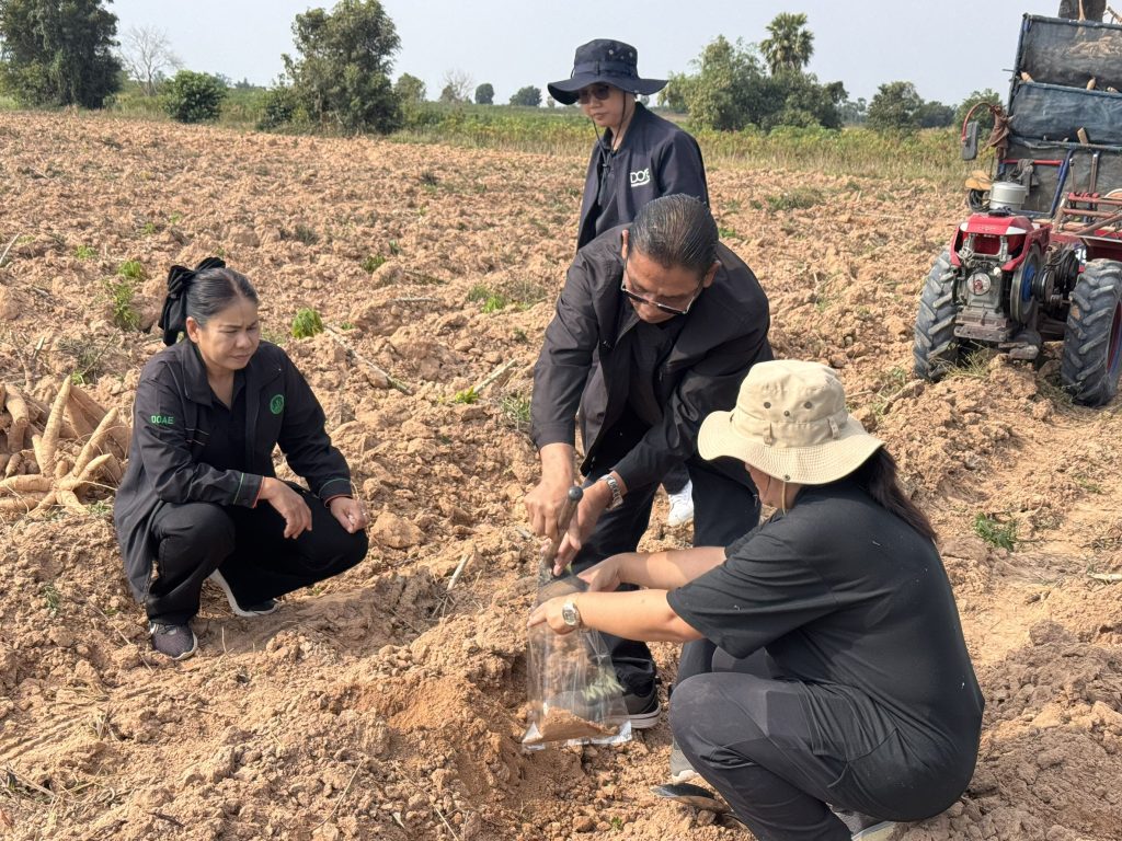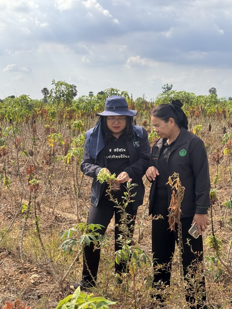 วันที่ 15 – 16 ธันวาคม 2568 นางดวงสมร พฤฑฒิกุล ผู้อำนวยการกองส่งเสริมการอารักขาพืชและจัดการดินปุ๋ย พร้อมด้วยเจ้าหน้าที่ ลงพื้นที่จังหวัดกำแพงเพชร เพื่อติดตามสถานการณ์การระบาดของโรคพุ่มแจ้ในมันสำปะหลัง ร่วมกับเกษตรจังหวัดกำแพงเพชร พร้อมเจ้าหน้าที่กลุ่มอารักขาพืช เกษตรอำเภอขาณุวรลักษณ์บุรี เจ้าหน้าที่ศูนย์ส่งเสริมเทคโนโลยีการเกษตรด้านอารักขาพืช จังหวัดพิษณุโลก ผู้นำชุมชน และเจ้าหน้าที่จากบริษัท ธนะวัฒน์ ควอลิตี้ สตาร์ช จำกัด  จากการลงพื้นที่สำรวจพบว่า อาการพุ่มแจ้เกิดจากหลายสาเหตุร่วมกัน จึงได้เก็บตัวอย่างมันสำปะหลังที่แสดงอาการพุ่มแจ้และนำส่งกรมวิชาการเกษตรตรวจวินิจฉัยหาสาเหตุที่แท้จริง เพื่อจัดทำคำแนะนำที่ถูกต้องเหมาะสมต่อไป  นอกจากนี้ได้มอบหมายให้ สำนักงานเกษตรอำเภอจัดหาแหล่งพันธุ์ที่สะอาดปลอดโรคและเผยแพร่ประชาสัมพันธ์ให้กับเกษตรกรทราบต่อไปด้วย