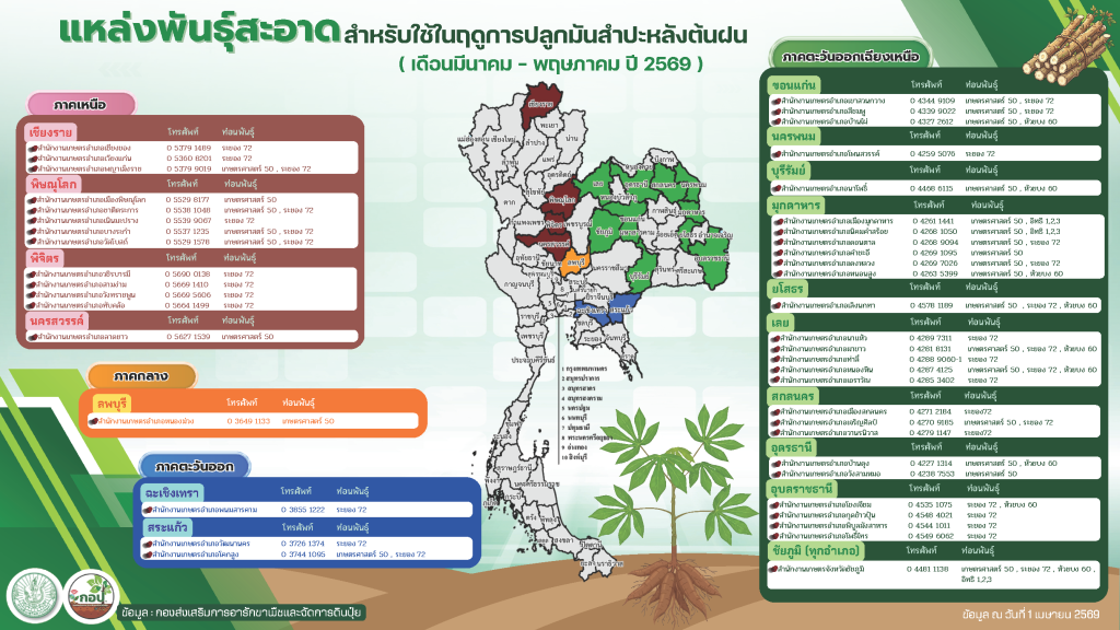 แหล่งพันธุ์สะอาดสำหรับใช้ในฤดูการปลูกมันสำปะหลังต้นฝนแหล่งพันธุ์สะอาด ( เดือนมีนาคม – พฤษภาคม ปี 2569 )By กพต. / 1 เมษายน 2026 Post Views: 11